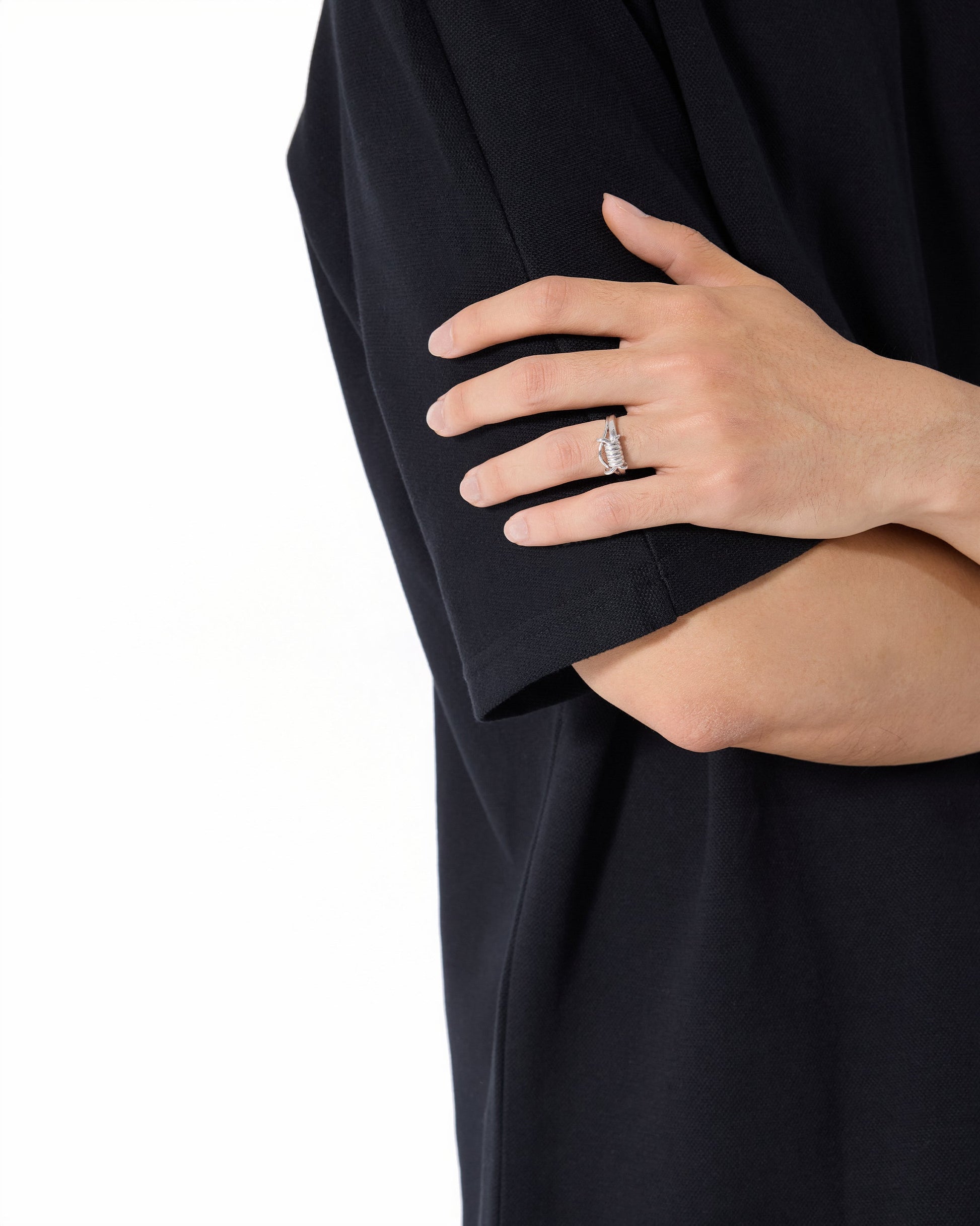 反骨精神に基づいて作られたバーブド・ワイヤー・リングは、有刺鉄線の無骨な魅力とスターリングシルバーの洗練された繊細さが絡み合い、インパクトのあるステートメント・アクセサリーに仕上がっている。