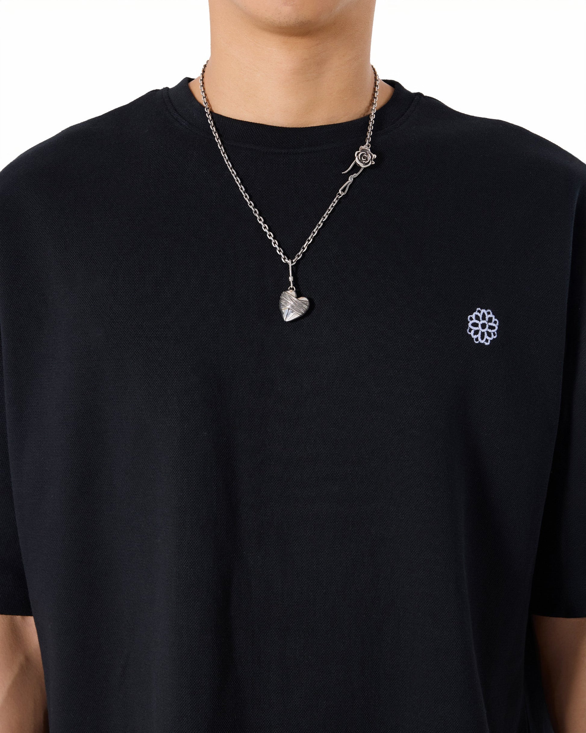 スターリングシルバーにハートを閉じ込めたこのペンダントは、なめらかな曲線と独特のテクスチャーを組み合わせたスタイリッシュでモダンなアクセサリー。