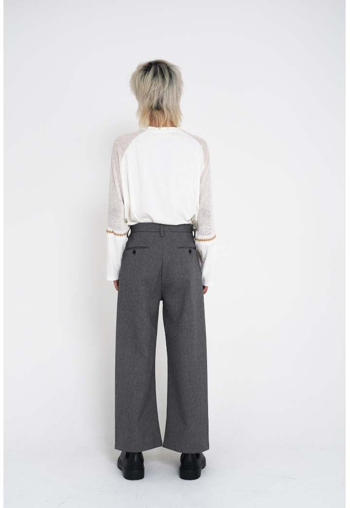 シアー素材のスリーブが特徴的なロンTは、繊細な透け感で軽やかな印象を与える。鮮明に際立つステッチワークがデザインのアクセントとなり、一枚で洗練されたスタイルを完成させる。上質な素材と丁寧な手仕事が融合した、さりげなく個性を演出する逸品。